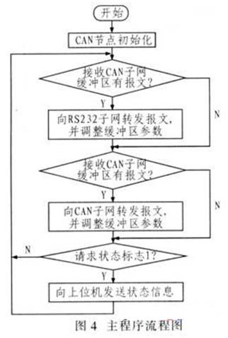 系統(tǒng)軟件程序設(shè)計(jì)包括:主程序、CAN節(jié)點(diǎn)初始化子程序、RS232報(bào)文發(fā)送子程序、RS232報(bào)文接收子程序、CAN報(bào)文接收子程序以及CAN報(bào)文發(fā)送子程序。其主程序流程圖如圖4所示。