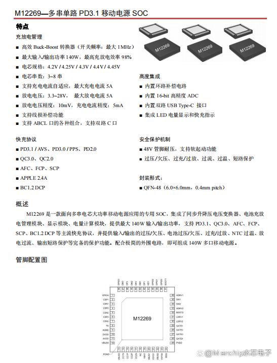 除了M12269這款明星產(chǎn)品外,MERCHIP水芯電子還推出了從22.5W-140W的完整快充充放電平臺(tái)。該系列芯片中的M12239等芯片可以支持兩路獨(dú)立快充,實(shí)現(xiàn)筆記本和手機(jī)同時(shí)快充。也可以多顆芯片并聯(lián)輕松實(shí)現(xiàn)多口快充充放電的復(fù)雜系統(tǒng)設(shè)計(jì)。該芯片家族包括以下成員: