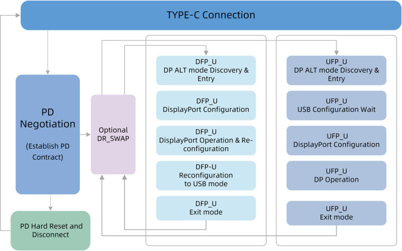 Type-C DP ALT模式協(xié)商流程都是通過USB PD協(xié)議的通信功能來完成,它是采用PD協(xié)議中VDM(Vender-Define message)的協(xié)議交互讓相連的設(shè)備進入 DP等數(shù)據(jù)傳輸功能。
