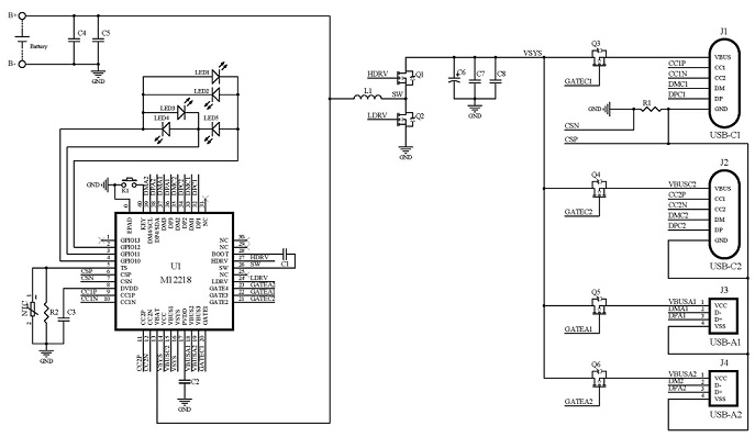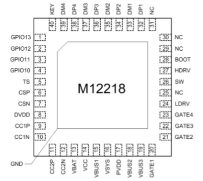 M12239是一款面向雙路獨立的多電芯大功率移動電源應用的專用 SOC,集成了同步升降壓變換器、電池 充放電管理模塊、顯示模塊、電量計算模塊,提供最大 140W 輸入/輸出功率,支持 PD3.1、QC3.0、AFC、FCP、SCP、BC1.2 DCP 等主流快充協(xié)議,并提供過壓/欠壓、過充/過放、過溫等完備的保護功能。配合極簡的外圍 電路,即可組成單 C口大功率移動電源。輔以DC-DC芯片,可以擴展為3-8串電池雙路獨立的多口大功率移動電源。 |