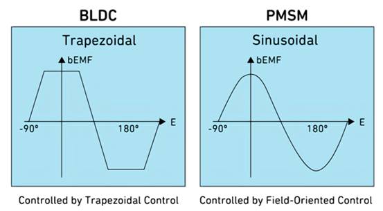 永磁同步電機(jī)和無刷直流電機(jī)之間的區(qū)別主要在于其定子繞組的形狀,以及由此產(chǎn)生的反電動(dòng)勢(shì)波形特性(參見圖3)。