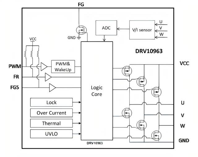 圖5所示為一個(gè)低功率無傳感器三相BLDC電機(jī)驅(qū)動(dòng)器TI DRV10963的功能框圖,該IC包含三個(gè)功率MOSFET,適合于最高5V/0.5A的BLDC電機(jī),可用于驅(qū)動(dòng)筆記本電腦和高性能處理器上使用的冷卻風(fēng)扇。DRV10963具有短路和過流保護(hù)功能,通過多路復(fù)用模數(shù)轉(zhuǎn)換器(ADC)監(jiān)測(cè)每個(gè)MOSFET的電流和電壓。PWM輸入可以用來控制并達(dá)到期望的電機(jī)速度。“FR”輸入允許在啟動(dòng)時(shí)改變電機(jī)方向,“FG”輸出提供電機(jī)速度信息。