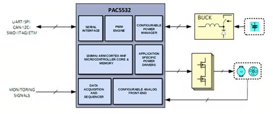圖6:電池供電電機(jī)控制應(yīng)用中Qorvo PAC5532的簡(jiǎn)化配置框圖。(來源:Qorvo)