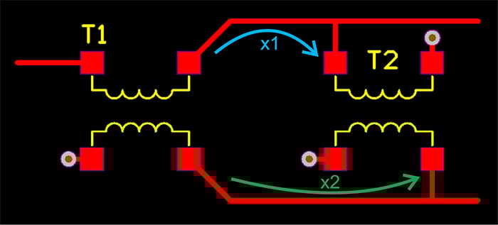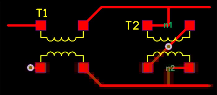 圖 5 顯示了該電路的另一種布局。在這種情況下,連接 T1 和 T2 的走線運行到中點(上路徑為 n1,下路徑為 n2),然后連接到 T2 的相應(yīng)焊盤。這使得兩條路徑相同。此外,請注意對稱走線用于 T2 的兩個接地焊盤。