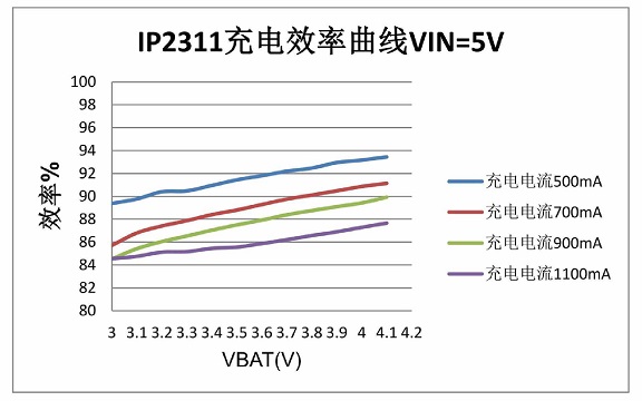 IP2311集成一個BUCK同步開關降壓充電控制器,其開關頻率為800KHz,輸入電壓為5V,電池電壓為3.7V,當充電電流為500mA時,充電效率接近93%。