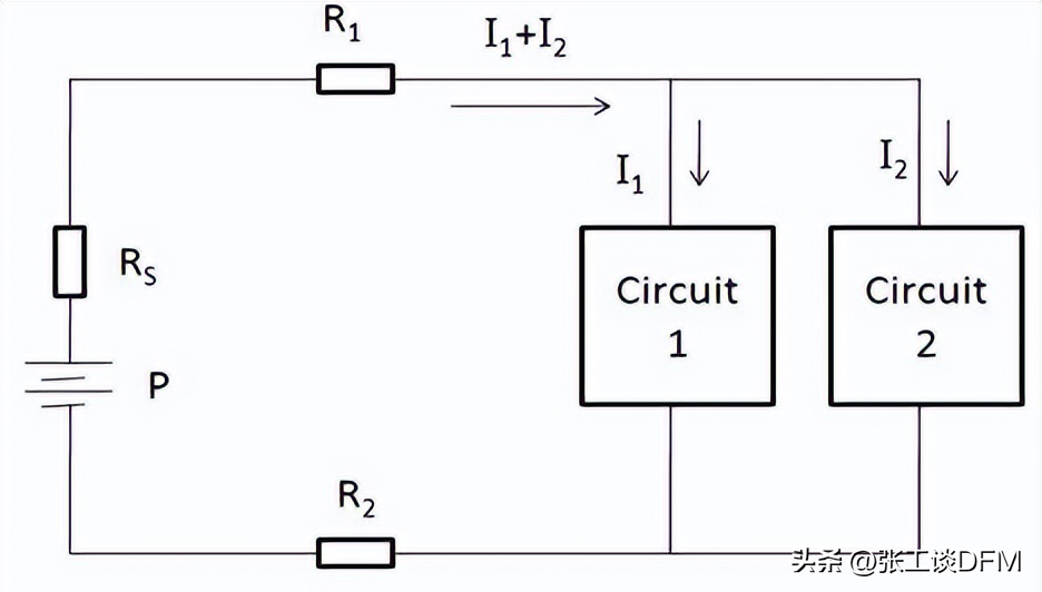 下圖顯示了通過(guò)共模阻抗進(jìn)行的噪聲去耦。電路1和電路2通過(guò)同一根導(dǎo)線獲得電源電壓的和接地環(huán)路。如果其中一個(gè)電路的電壓突然需要提高,另一個(gè)電路將降低,因?yàn)楣搽娫春蛢蓚(gè)回路之間的阻抗。