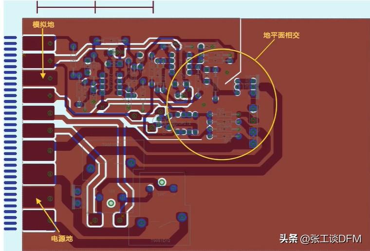 承載模擬信號(hào)的軌道應(yīng)遠(yuǎn)離高速或開關(guān)信號(hào),并應(yīng)始終受到接地信號(hào)的保護(hù)。低通濾波器可用于避免模擬軌道周圍的高頻噪聲。此外,重要的是模擬和數(shù)字子系統(tǒng)的地平面不要共用 。