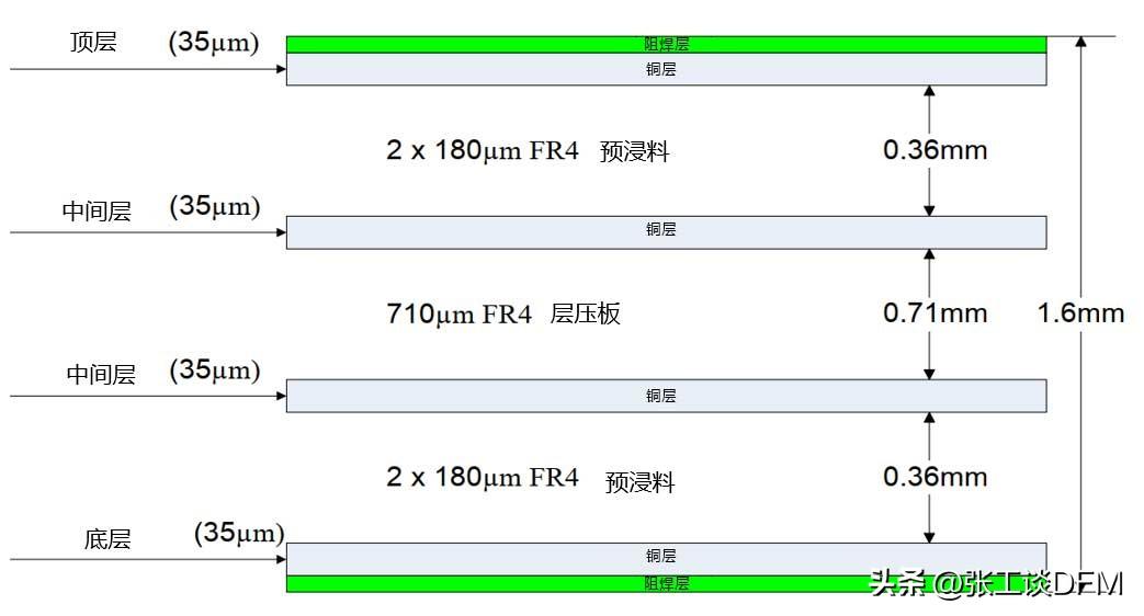 下圖顯示了圍繞核心(層壓板)構(gòu)建的 FR4 1.6 毫米 4 層 PCB 的疊層。核心是兩面都有銅層的厚介電片。核心的頂部和下方添加了薄的預(yù)浸料,即介電材料片。對(duì)于這種特定情況,中間層 1 和 2 分別代表接地層和電源層。頂層和底層用作信號(hào)平面,每側(cè)可以焊接多個(gè)組件。多層堆疊的配置在 EMC 應(yīng)用中起著至關(guān)重要的作用。