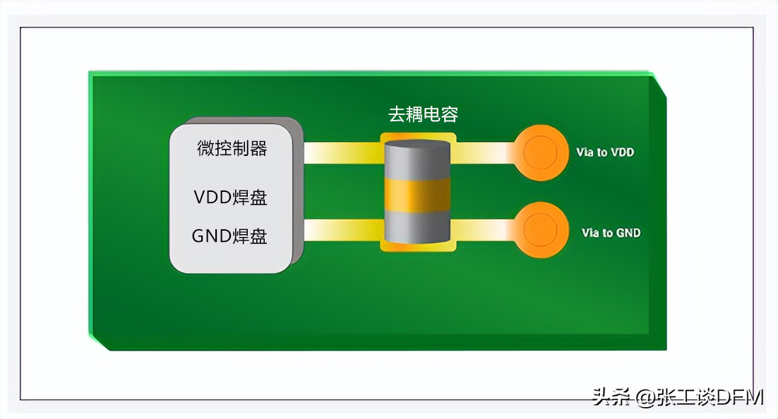 當(dāng) IC 工作時(shí),由于其內(nèi)部結(jié)構(gòu),它們會(huì)以高頻進(jìn)行切換。這種情況會(huì)在 IC 連接軌道中產(chǎn)生開關(guān)噪聲。如果不控制這種噪聲,它將導(dǎo)致發(fā)射,從而導(dǎo)致 EMI 。通過(guò)在 IC 附近放置一個(gè)去耦電容,可以減少 PCB 上開關(guān)噪聲的傳播并將噪聲引導(dǎo)至地面。