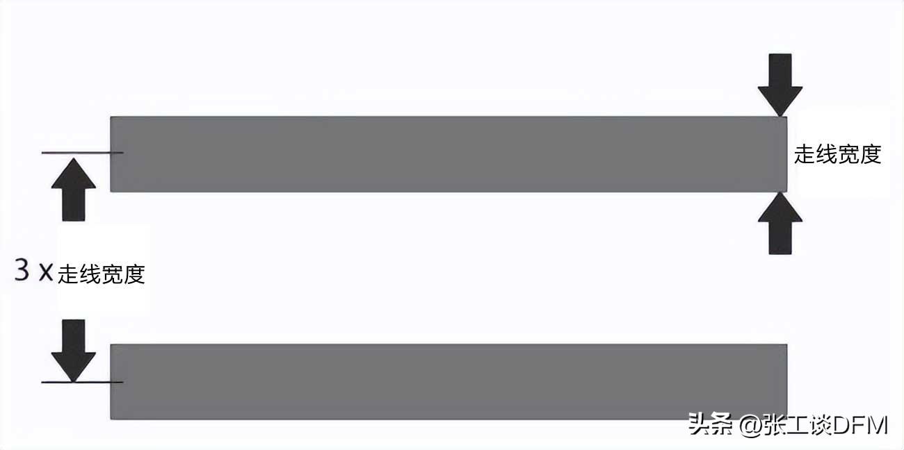 走線分離可最大限度地減少相同或不同 PCB 層上相鄰/平行跡線之間的串?dāng)_和電磁耦合。一般規(guī)則規(guī)定走線之間的間隔(在中心到中心之間測(cè)量)應(yīng)大于或等于 3 x 走線寬度。間隔越大,串?dāng)_和耦合越低。