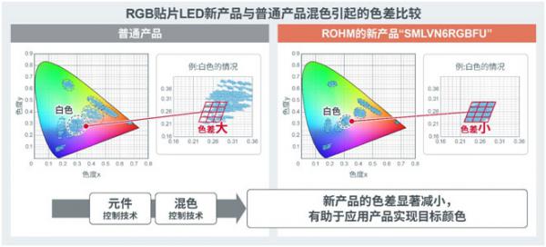 通常,要想使RGB貼片LED發(fā)出目標(biāo)顏色的光,需要可以精準(zhǔn)地控制其紅、綠、藍(lán)(RGB)發(fā)光元件的顏色和亮度的技術(shù),以及能夠提高混色性能的技術(shù)。ROHM利用其從元件制造階段就能融入優(yōu)勢(shì)技術(shù)的一貫制生產(chǎn)體系,成功地抑制了元件的色差問(wèn)題,實(shí)現(xiàn)了優(yōu)于普通產(chǎn)品的色彩表現(xiàn)。另外,通過(guò)元件的混色控制技術(shù),減少了RGB貼片LED混色時(shí)容易發(fā)生的色差,有助于實(shí)現(xiàn)汽車(chē)內(nèi)飾等所需的目標(biāo)顏色。此外,ROHM還利用與所需規(guī)格相匹配的色度仿真系統(tǒng),提供精細(xì)配色支持。