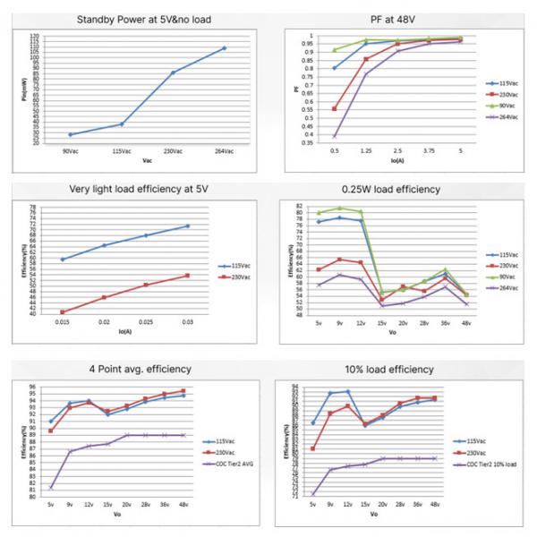 該方案在230Vac和5V輸出沒接負載的情況下,輸入功率小于100mW, 待機功耗及48V下PF曲線如下圖。在5V小負載下的效率及各個輸出下0.25W的效率也很好。在115 VAC(藍色曲線)和230 VAC (紅色曲線)輸入電壓的平均能效和輕載(10%負載)能效,從下面曲線圖可看到都遠高于COC V5 Tier 2平均能效標準和COC V5 Tier 2輕載能效標準,由于PFC在5V,9V,12V時停止工作,所以可以看到這幾個電壓下效率較高,28V和48V滿載下的效率也非常高。