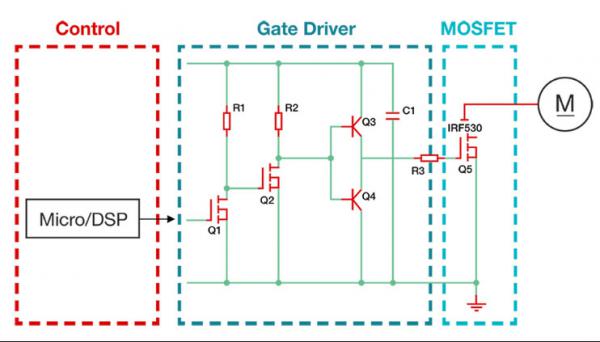 您可以使用 BJT 圖騰柱/推挽電路作為柵極驅(qū)動(dòng)電路來驅(qū)動(dòng)單個(gè) MOSFET,如圖 2 所示。盡管此方法成本很低且易于實(shí)現(xiàn),但 BJT 圖騰柱電路所需的外部元件數(shù)量較多且占用的布板空間較大。此外,您必須復(fù)制此分立式電路,因?yàn)槟枰鄠(gè) MOSFET 來驅(qū)動(dòng)電機(jī),致使所需的元件數(shù)量和布板空間成倍增加。