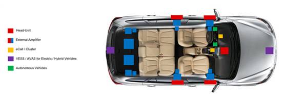 隨著電動(dòng)汽車(chē)的發(fā)展,車(chē)載音響系統(tǒng)的信道的數(shù)量和輸出功率均在逐步上升。在影音娛樂(lè)系統(tǒng)中,高通道數(shù)量和高輸出功率的音響系統(tǒng),可以產(chǎn)生更大的音壓和動(dòng)態(tài)范圍,包裹感空間感更強(qiáng),進(jìn)而實(shí)現(xiàn)劇場(chǎng)效果的360度立體環(huán)繞聲。除車(chē)載娛樂(lè)外,車(chē)載音響系統(tǒng)還具備許多功能。電動(dòng)汽車(chē)相比傳統(tǒng)內(nèi)燃機(jī)汽車(chē)安靜,為保護(hù)行人減少事故發(fā)生,所有新型電動(dòng)車(chē)需要有一個(gè)發(fā)出適當(dāng)聲音的聲學(xué)車(chē)輛報(bào)警系統(tǒng)(AVAS)。另外,在緊急呼叫(Ecall)系統(tǒng)中,音響系統(tǒng)可以通過(guò)觸發(fā)防撞提示和車(chē)輛偏離警告,讓駕駛員和緊急調(diào)度員取得聯(lián)系。音響系統(tǒng)中包含許多部分,除喇叭外,還有功率放大器、 ADC、Codec等等。其中,D類(lèi)功率放大器以高輸出功率,高效率,小體積等優(yōu)點(diǎn),在車(chē)載音響領(lǐng)域異軍突起。