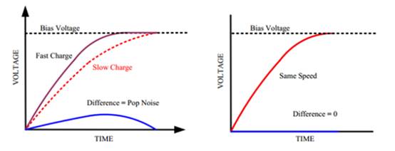 對(duì)于差分功放而言,如果P端和N端的輸出外圍硬件電路不匹配或者輸入外圍硬件電路不匹配,功放兩端輸入信號(hào)建立時(shí)間會(huì)不一樣,該差分信號(hào)差也會(huì)輸入功放并形成pop音。 如下圖所示,若A1兩端電壓上升速度一致,pop noise為0。5ns的信號(hào)建立時(shí)間差即可產(chǎn)生人耳可聽(tīng)到的pop音。