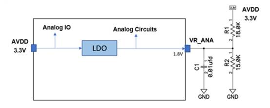 如圖4所示,VR_ANA的電壓由AVDD經(jīng)LDO轉(zhuǎn)換而來(lái),這會(huì)導(dǎo)致VR_ANA的電壓比AVDD上升慢。此處通過(guò)把AVDD 3.3V電阻分壓得到 1.5V ,在 VR_ANA 上放置一預(yù)偏置電壓,確保VR_ANA 與 3.3V 同時(shí)上升,進(jìn)而降低pop noise。其中,電容器用于消除 3.3V 的噪聲。
