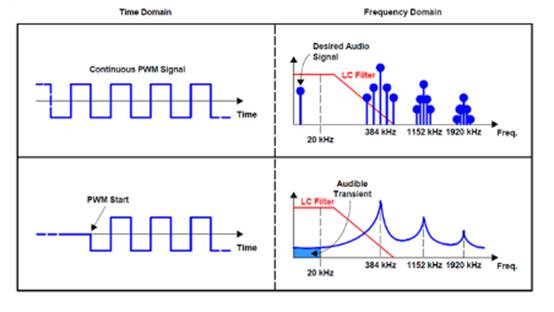 在系統(tǒng)掉電或上電,功放播放狀態(tài)切換,或輸入音源切換時(shí),PWM會(huì)產(chǎn)生啟停,進(jìn)而產(chǎn)生瞬態(tài)的POP音。如下圖所示,在連續(xù)PWM動(dòng)作時(shí),開(kāi)關(guān)頻率及其附近的鏡像頻率都可以順利的被LC濾波器濾除。而在PWM啟停時(shí),開(kāi)關(guān)頻率及其奇次諧波會(huì)延伸到人耳可聽(tīng)的20-2kHz范圍內(nèi)。該開(kāi)關(guān)頻率低于LC濾波器的截止頻率,不能被濾除進(jìn)而產(chǎn)生pop音。