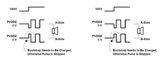 對(duì)于BTL結(jié)構(gòu)的功放在進(jìn)行AD調(diào)制時(shí),PWM開(kāi)啟第一個(gè)Duty cycle,如果A-side拉低,Bootstrap 電容可以順利充電,但B-side在此時(shí)拉高,這使得Bootstrap電容充電失敗。Bootstrap電容提供N MOSFET的充電電壓,如Bootstrap電容充電失敗,則B-side 第一個(gè)PWM不能正常輸出。A-side和B-side的不平衡輸出會(huì)產(chǎn)生明顯的POP音。 TI針對(duì)該類(lèi)pop noise進(jìn)行了優(yōu)化,在AD和BD調(diào)制中,都使得第一個(gè)PWM為低,進(jìn)而消除Clock fault。