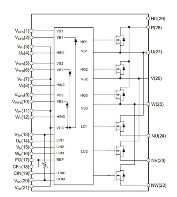 IPM29- SiC_MOS智能功率模塊新產(chǎn)品內(nèi)部集成了新一代N溝道增強型1200V-SiC_MOSFET芯片與與優(yōu)化的SOI工藝6通道柵極驅(qū)動芯片,作為緊湊的1200V等級封裝,這款SiC MOSFET IPM使用簡便,針對SIC定制優(yōu)化驅(qū)動部分,有效減小開關(guān)振蕩。此外,它采用緊湊式封裝,得益于使用具備很高熱導(dǎo)率的DBC基板,具有良好熱性能和充足的電氣隔離等級能力,具有出色的功率密度、可靠性和性能。它針對相關(guān)應(yīng)用進行了優(yōu)化,是一款用于高效率的電機驅(qū)動與有源功率校正電路的高效逆變平臺而設(shè)計的個性化產(chǎn)品。例如供暖通風空調(diào),風扇電機,車載空調(diào)及三相功率因數(shù)校正。