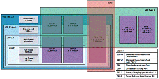 隨著時間推移,消費者開始要求USB提供更多功能。他們想通過USB電纜快速給電池充電,此時500 mA最大電流已經(jīng)無法滿足要求。BC1.2標準允許通過USB電纜傳輸高達7.5 W功率——5 V電壓 和1.5 A電流,該標準滿足了這些消費者的需求。BC1.2標準擴展了通過USB電纜為電池充電的能力,在BC1.2標準之后,每一項新標準都在之前的基礎上增加了功率容量。Type-C 1.3將功率容量擴展到15 W(最大值),而USB PD 3.0使系統(tǒng)功率升級達到100 W(最大值)。其最新的規(guī)格更新USB PD3.1將功率容量進一步擴展到了 240 W(最大值)。