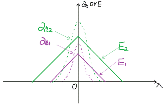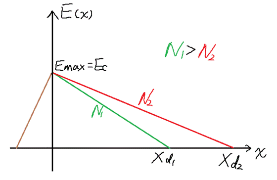 接下來我們通過舉例來看擊穿電壓VB與哪些因素相關(guān):圖[5]所示為兩種摻雜濃度材料的Ec VS Xd曲線關(guān)系(其中,N1>N2)。