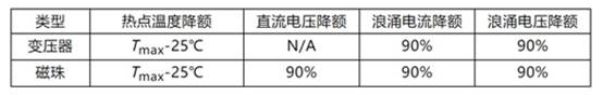最后,磁珠選型時還需要注意降額使用。磁性器件的降額標(biāo)準(zhǔn)如表所示。