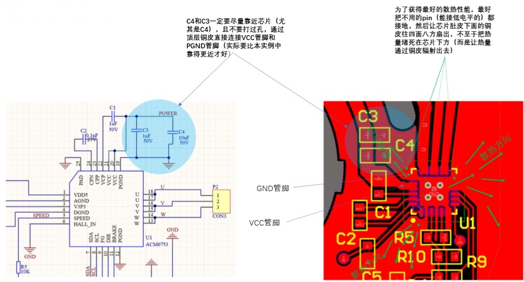 3. DIR管腳作為最高優(yōu)先級去控制電機(jī)轉(zhuǎn)動方向,建議在項(xiàng)目早期不確定U/V/W三相線序的情況下對DIR管腳做上拉或者下拉電阻的兼容設(shè)計(jì)(但是焊接的時候一定只能焊接其中一顆電阻,如圖中R7和R11只能焊接其中一顆)