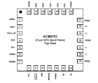 ACM6763是一款三相無刷直流電機驅(qū)動芯片,內(nèi)部集成 無感三相無刷電機驅(qū)動算法、相電流檢測電流電路、柵極驅(qū)動電路以及功率MOS管. 支持最大5A的相電流.