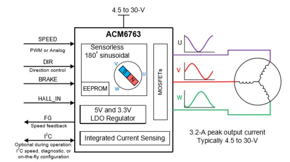 ACM6763的高集成度以及精簡外圍特別適用于高功率密 度、小尺寸、靜音要求高的三相無刷電機驅(qū)動器應(yīng)用場景.