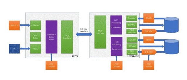 除了ASIC,F(xiàn)PGA也被用于實現(xiàn)FOC控制算法,例如中電港聯(lián)合全球知名半導體解決方案供應商瑞薩電子及萊迪思半導體推出高性能EtherCAT伺服驅動解決方案,采用Renesas MPU+Lattice FPGA雙芯片架構。