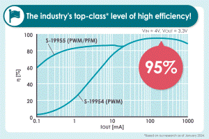 「S-19954/5系列」的高效率在功能相同產(chǎn)品中達(dá)到了業(yè)界最高水準(zhǔn)(在輸入電壓4V、輸出電壓3.3V時為95%)的功率轉(zhuǎn)換效率。