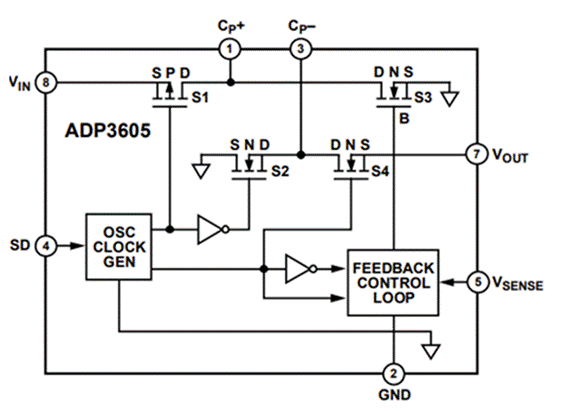 圖3 - ADI ADP3605的內(nèi)部架構看是電荷泵架構通過增加輸出反饋調(diào)節(jié)環(huán)路控制開關的導通電阻來調(diào)節(jié)穩(wěn)定輸出。
