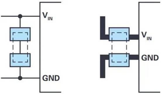 圖2. 以不利方式連接的旁路電容(左側(cè))和以有利方式連接的旁路電容(右側(cè))。