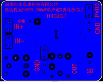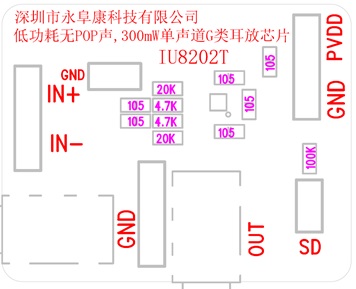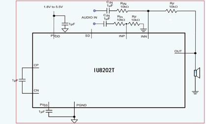 IU8202T采用單端模式輸出,其直驅(qū)模式結(jié)構(gòu)單電源供電時能夠產(chǎn)生以地為參考的輸出,從而省 去了大尺寸的隔直電容,既節(jié)省了成本和電路板空間, 也降低了元件的高度。