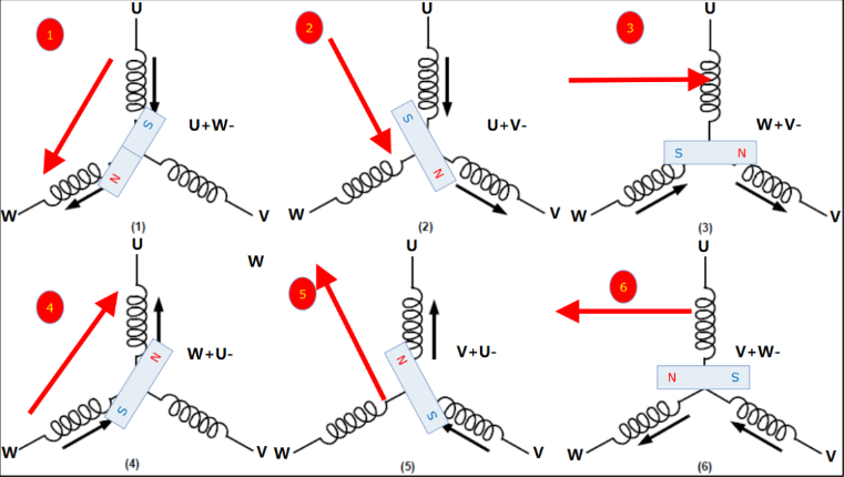根據(jù)右手定則,通電的導體產(chǎn)生的磁場方向可以知道:當U-W相通時,兩個線圈產(chǎn)生的磁場進行合成,就是磁場矢量。(磁體之間,存在同性相斥,異性相吸的原理)