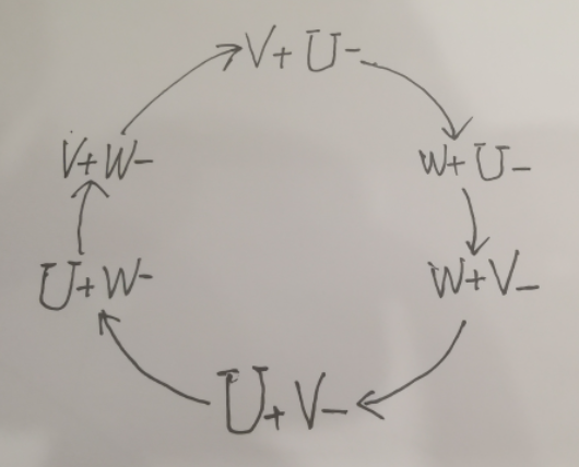 V+U- W+U- W+V- U+V- U+W- V+W- (有一個特點:按照UVW這個順序變化的是正轉(zhuǎn))W+ W+ U+ U+ V+ V+,負也是這樣的。