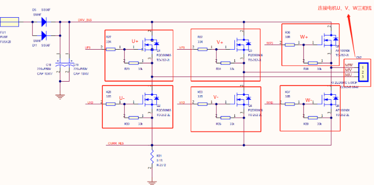 注意了:半橋不是指上面那三個功率管,而是UVW三個半橋,U+U-這算是一個半橋。