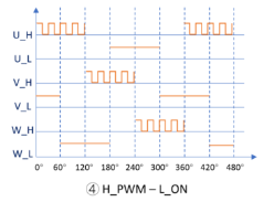 H_PWM – L_ON: 某一相上半橋始終以PWM方式控制,另一相下半橋始終保持高電平(也就是下半橋常開導通)