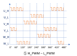 H_ON – L_PWM:某一相上半橋始終保持高電平(也就是上半橋常開導通),另一相下半橋始終以PWM方式控制