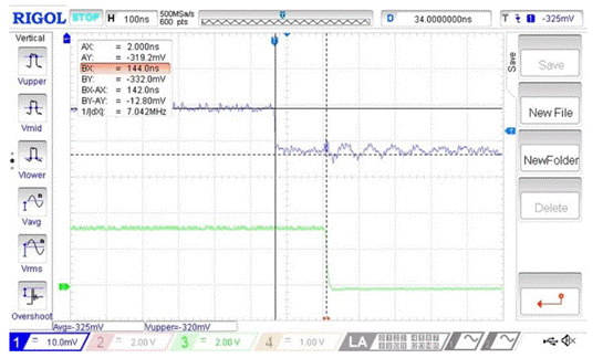 VIN(CH1), VOUT(CH2), VREF=320mV(保護(hù)閾值),NSI22C12保護(hù)延時實測144ns