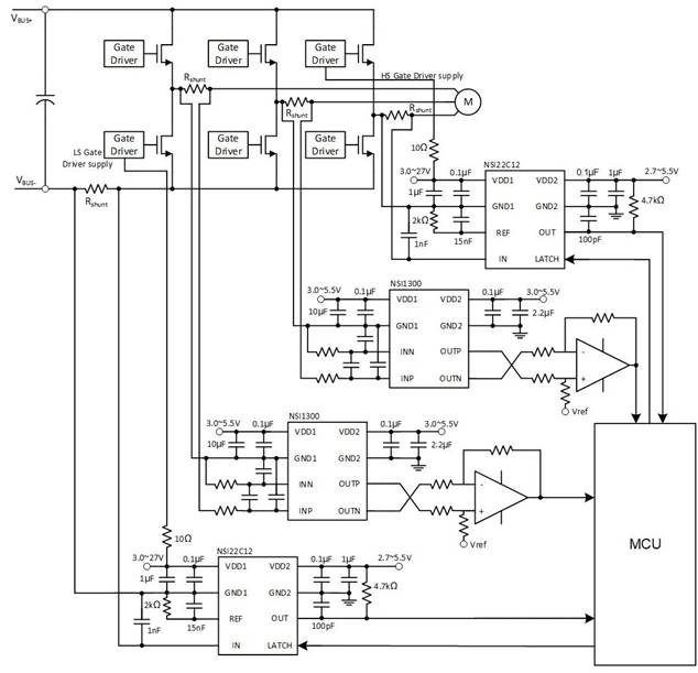 NSI22C12在電機驅(qū)動系統(tǒng)中做母線/相電流保護(hù)典型應(yīng)用框圖