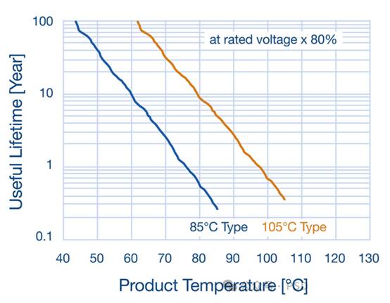 圖2:溫度對(duì)MLCC壽命的影響(圖源:Murata)