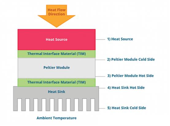 圖4所示即為熱源和散熱器之間的熱能流動(dòng)。CUI Devices提供一系列標(biāo)準(zhǔn)型和微型珀?duì)柼K,可適應(yīng)高達(dá)+77°C的溫度梯度。