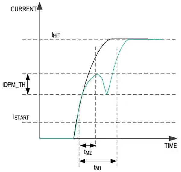 前四項(xiàng)是眾所周知的標(biāo)準(zhǔn)功能。DPM 則需要進(jìn)一步解釋。舉例而言,在螺線管控制的閥門中,如果螺線管啟動(dòng)時(shí)閥門工作正常,則電流分布不是單調(diào)的(圖 3,黑色曲線)。相反,受柱塞運(yùn)動(dòng)產(chǎn)生的反向電動(dòng)勢(shì) (BEMF) 影響,電流會(huì)出現(xiàn)下降(圖 3,藍(lán)色曲線)。