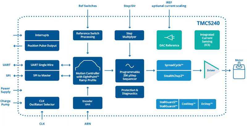 圖 5:TMC5240 高性能步進(jìn)電機(jī)控制器和驅(qū)動(dòng)器 IC 中嵌入了復(fù)雜的算法,可幫助螺線管和步進(jìn)電機(jī)實(shí)現(xiàn)最佳性能。(圖片來(lái)源:Analog Devices)