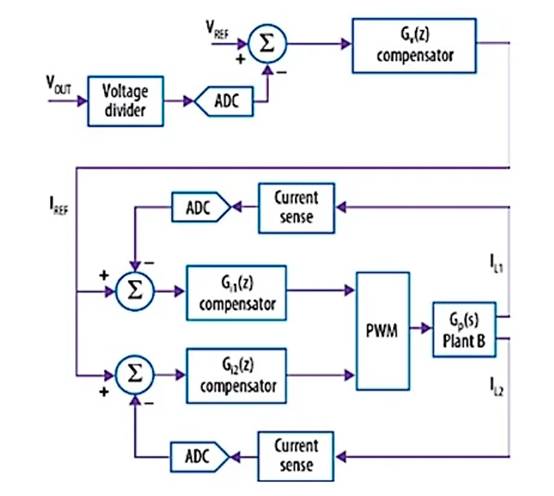 降壓和升壓模式均采用數(shù)字平均電流模式控制?刂瓶驁D如圖所示。2. 對兩個獨(dú)立的電流環(huán)路使用相同的電流基準(zhǔn) I REF將兩個電感器中的電流調(diào)節(jié)至相同值。兩個內(nèi)部電流環(huán)路的帶寬設(shè)置為 6 kHz,外部電壓環(huán)路帶寬設(shè)置為 800 Hz。