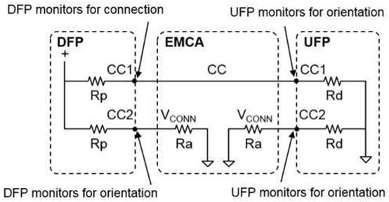規(guī)范描述了 Type-C 上行端口 (UFP) 如何在配置通道引腳 CC1 和 CC2 上應(yīng)用下拉電阻 (R d ) 以表示它是一個(gè)設(shè)備, Type- C 下游端口 (DFP) 需要在 CC1 和 CC2 上具有上拉電阻 (R p )。生成的電阻分壓器用于確定 Type-C 設(shè)備的連接和分離。每個(gè)插座中 Type-C 電纜插頭的方向很容易確定,因?yàn)殡娎|上只有兩個(gè) CC 引腳中的一個(gè)連接。