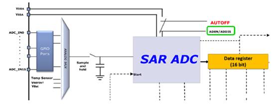 3個內部信號源,分別為內部溫度傳感 (VSENSE) 輸入、內部參考電壓 (VREFINT) 輸入、外部電池 VBAT 供電引腳輸入