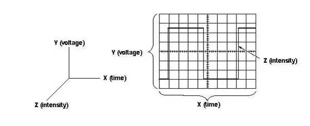 在示波器顯示屏上,橫坐標(biāo)(X)代表時(shí)間,縱坐標(biāo)(Y)代表電壓,(注,如果示波器有測(cè)量電流的功能,縱坐標(biāo)還代表電流。)還有就是比較少被關(guān)注的-亮度(Z),在TEK的DPO示波器中,亮度還表示了出現(xiàn)概率(它用16階灰度來(lái)表示出現(xiàn)概率)。