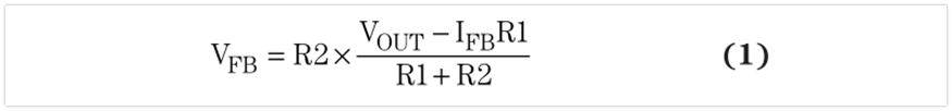 圖2顯示了電阻式反饋分壓器(R1和R2)的電流通路。反饋漏電流(IFB)固定不變時,R1的電流( lR1)隨著R1和R2值增加而減小。因此,分壓器電阻增加也就意味著進入反饋引腳的IR1漏電流百分比更大,并且R2的電流(1R2)降低,從而產(chǎn)生低于預期的反饋引腳電壓( VFB )。我們將 VFB 同一個內部基準電壓比較,以此來設置輸出電壓,因此反饋電壓的任何一點誤差都會導致輸出電壓不精確。我們可以由基爾霍夫( Kirchhoff )電流定律推導出方程式1.其表明VFB為R1和R2的函數(shù):